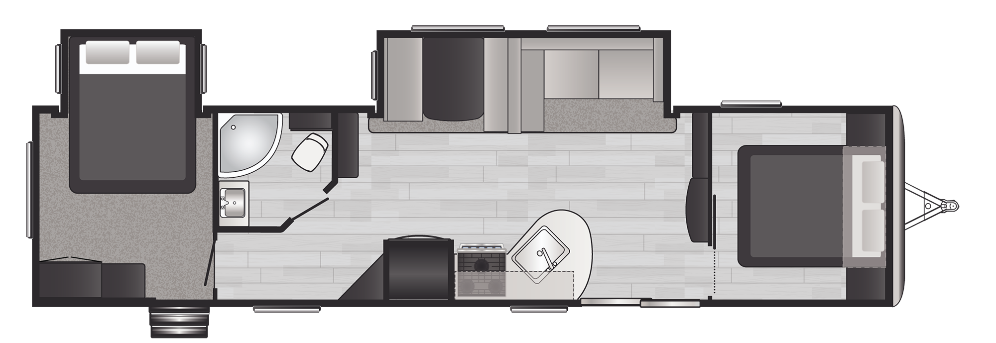 Two power awnings this travel trailer offers unique dual rooms so everyone can enjoy their own privacy! In the rear of the grey wolf 29qb, there is a privet bedroom with a queen bed. This floorplan offers plenty of room for a larger family to camp together with the private bedroom with a queen bed and the second bedroom with bunks and wardrobe storage. The king bed is located towards the rear of the travel trailer and the design allows for plenty of space in the bedroom. So here are the list of 10 best travel trailers, all featuring 2 bedroom floor plans. The jayco jayflight is an excellent travel trailer that offers tons of features at a very good price. The spacious master suite up front includes a dresser, an enormous closet. This is a true 2 bedroom rv perfect for entertaining. This is connected to the weight ratings like the trailer's dry weight (otherwise known as the unloaded vehicle weight) and the gross vehicle weight rating (gvwr) of the vehicle that would be hauling it. Enjoy our buyers guide for tips on what to look for in a great two bedroom travel trailer. The following buyer's guide reviews are designed to help you find the perfect travel trailers with 2 bedrooms. All of this fits into only 29 feet of space, something we'd love to see more often. The solitude 377mbs is another fifth wheel two bedroom travel trailer with queen size dimensions.